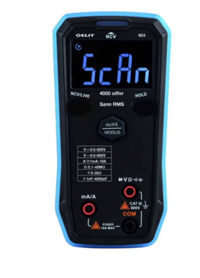 Smart multimeter som automatiskt väljer ACV/DCV/OHM. True RMS, CAT III 600V och 1m falltestad.