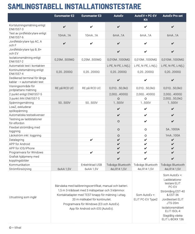 • Tester: kontinuitet, isolering, jordplatta, RCD, kortslutningsström, spänning/fasrotation.