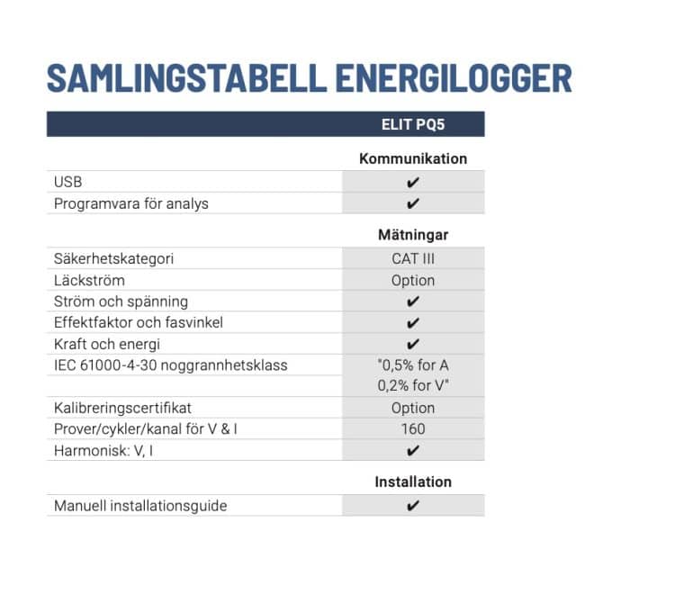 1-fas och 3-faslogger för spänning, ström, effekt, THD, kWh/kVAR/kVA, effektfaktor och frekvens